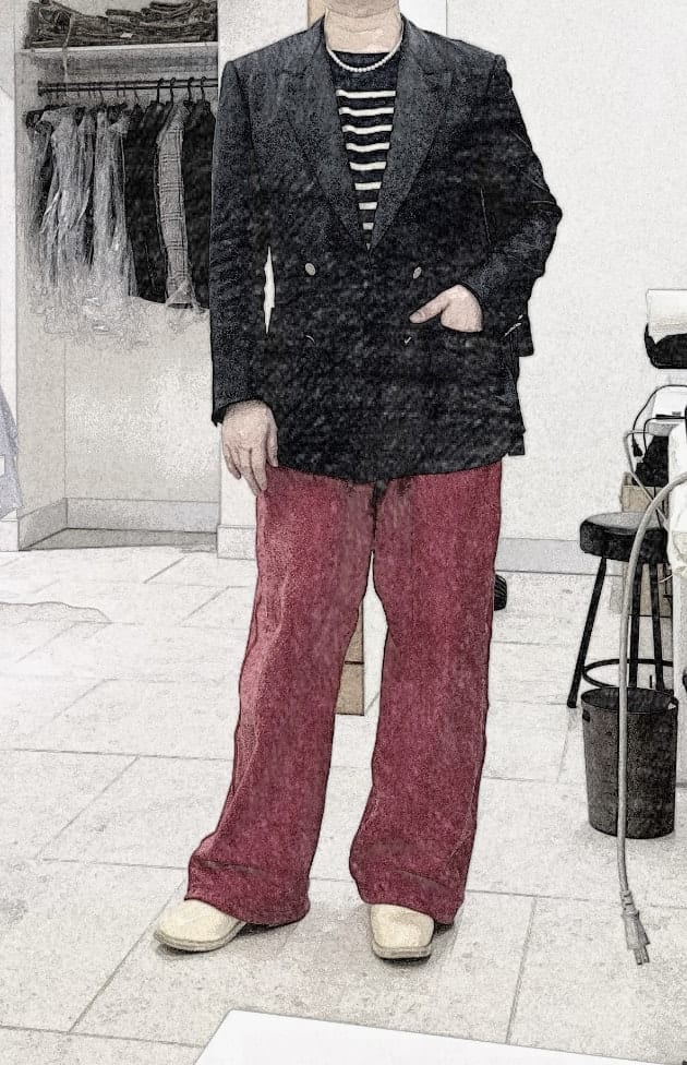 大体の時間は工房でパンツを縫ってますがちゃんとブレザー着てます。相変わらずミシンが踏みやすい様にスウェットパンツですが。