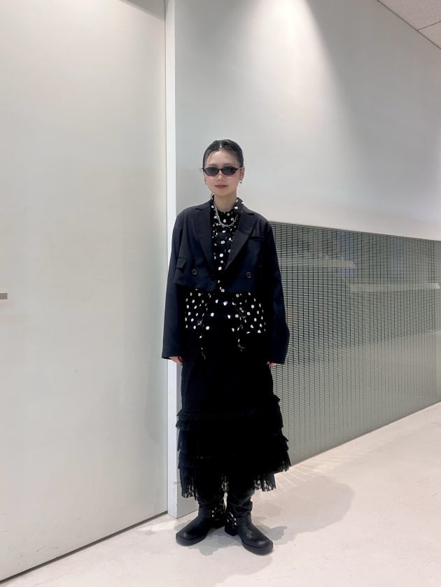 オールブラックのカッコイイコーディネートのポイントにドットが相性抜群◎