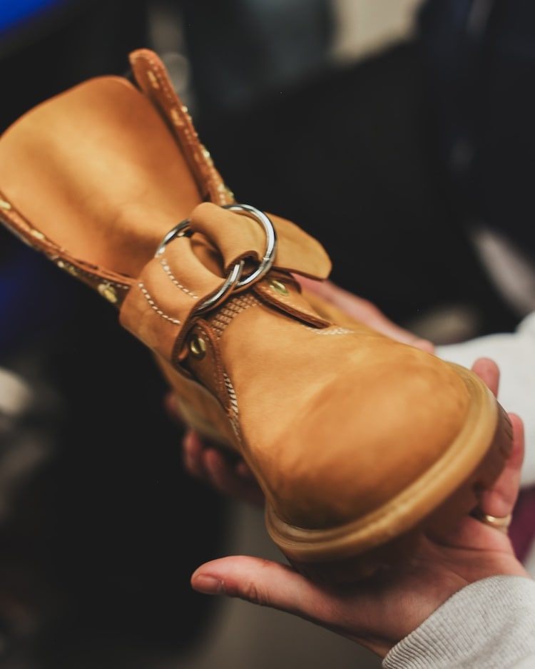 コレクションを象徴する『6インチ イエローブーツ』は、アイコニックなレースアップではなく、特別感のあるリングブーツ仕様に。このパーツは別注の象徴的なデザイン言語となり、キャップのアジャスターやベルトにも同様のデザインを採用している。