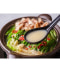 五島産の椿油やお茶などを配合した良質なエサを食べて、島の豊かな自然の中で育った五島の地鶏「しまさざなみ」。その鶏ガラを香ばしく焼き上げ、鶏皮から作った自家製の鶏油を加えてじっくりと煮込んで出汁をとりました。鶏のうまみとほんのりとした香ばしさが感じられる仕上がりが特徴です。「お肉や野菜をたくさん食べたい」という日におススメです。〆には春雨が合います。